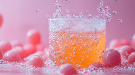 A refreshing pink drink with fruit and fizzy bubbles, served in a glass against a pastel pink background, creating a playful vibe.