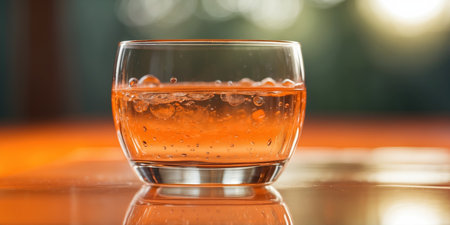 AI Generated. Clear glass half full of water on orange background with reflection and shadow