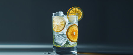 AI Generated. Refreshing Citrus Beverage with Ice in a Glass on Dark Background