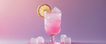AI Generated. Refreshing Pink Lemonade with Lemon Slice and Ice Cubes in a Decorative Glass - The Ultimate Summertime Drink on a Soft Pink and Purple Background