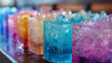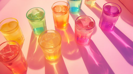 Discover a vibrant arrangement of colorful drinks in glasses, showcasing refreshing beverages with ice, perfect for summer parties and celebrations.
