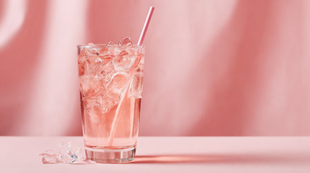 A chilled glass filled with ice and a sweet pink beverage offers a refreshing delight under soft lighting.
