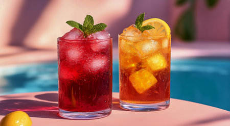 Delicious beverages sit on a pink table, filled with ice and garnished with lemon slices and mint. Bright sunlight reflects off the pool nearby, enhancing the tropical vibe.