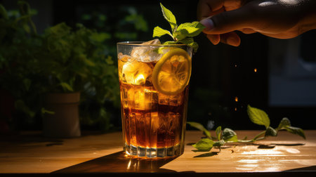 Glass of iced tea covered with condensation, topped with ice cubes, offers a refreshing escape from the summer heat, perfect for cooling down and enjoying a moment of relaxation