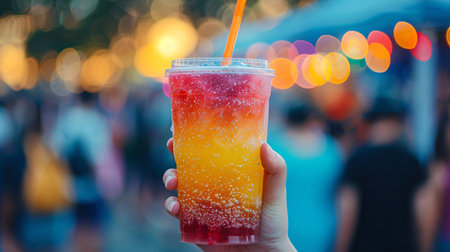 Human hand holding colorful slushie drink in plastic cup on street. Rainbow frozen juice cocktail