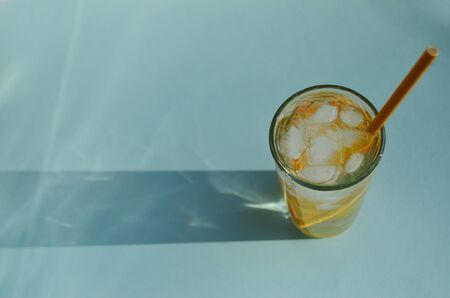 lemon water with ice in a glass glass with a yellow tube on a mint background with a shadow
