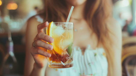 woman's hand holding a cocktail over her hand, generative ai