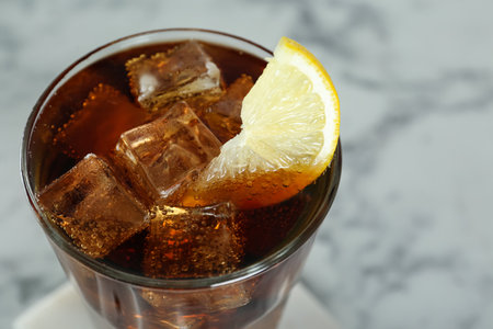 Glass of cola with ice and lemon
