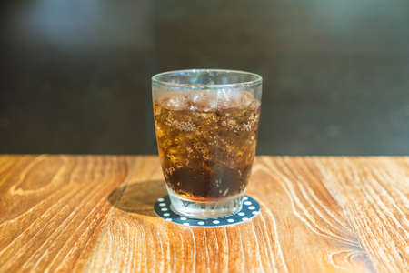 Refreshing black soda soft drinks with ice in a clear glass on wooden tabel
