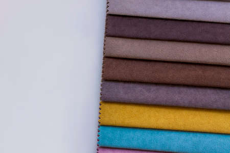 A palette of velor soft fabric in different colors for furniture upholstery as a background close-up, fashion fabric for backdrops
