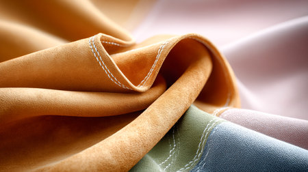 Closeup of soft colorful suede fabric with visible stitching, showcasing texture and textile craftsmanship.
