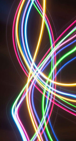 Colorful light trails in motion, vibrant neon streaks creating an energetic and dynamic abstract background