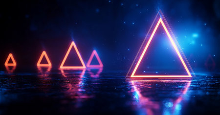 A Neon triangles illuminated in blue and red light reflect on dark surface, creating mesmerizing abstract background. vibrant colors and shapes evoke sense of depth and intrigue