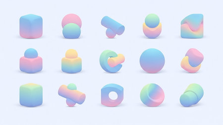 A collection of 3D abstract shapes with soft pastel color gradients, arranged on a light blue background.