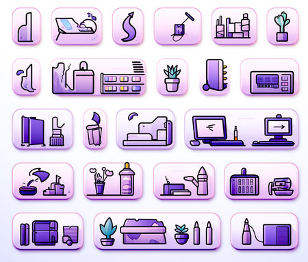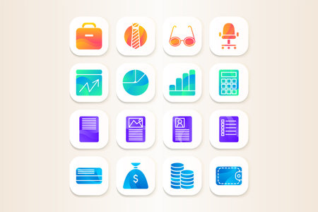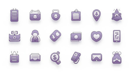 Eighteen purple gradient with subtle shadows, showcasing a variety of business and personal like a calendar, heart, and smartphone.