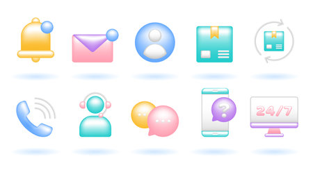 3D Icon Set of Customer Service Concept. Bell, Email, Profile, Package, Return, Phone, Call Center, Chat, 247. Cute Realistic Cartoon Minimal Style. 3D Render Vector Icons UX UI Isolated Illustration.