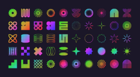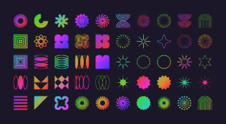 Brutalist geometric shapes, modern symbols with halftone effect. Colorful neon simple primitive elements and forms. Retro design, trendy contemporary minimalist style, y2k. Vector illustration