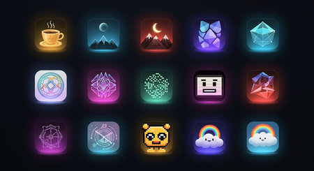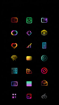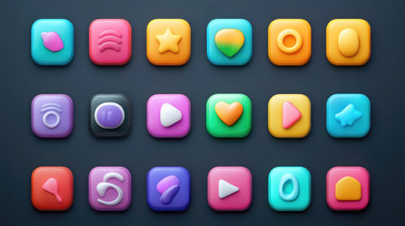 A vibrant assortment of digital icons arranged in a grid, showing different colors and shapes for application use, set against a dark backdrop.