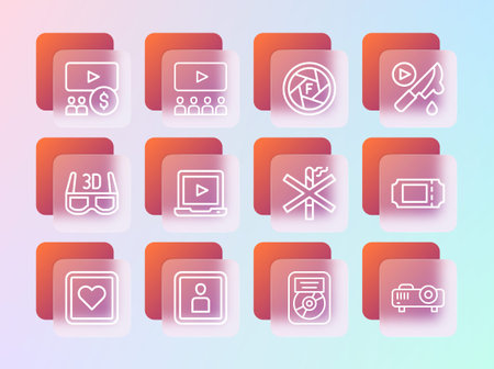 Set line Thriller movie Play Video No smoking CD disk award frame Online play video Camera shutter Cinema auditorium with screen and icon. Vector.