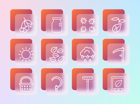Set line Sprout Sickle Cloud with rain Garden rake Seeds of specific plant Colorado beetle Fresh berries and Glass jar screw-cap icon. Vector.