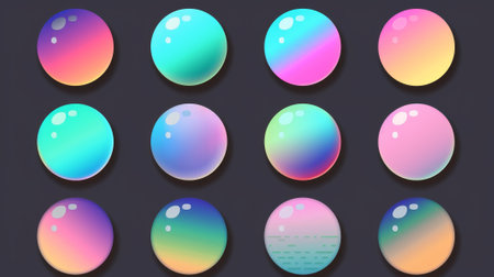 Rounded holographic gradient sphere set. Gradient colorful sphere in trendy style. Multicolor round buttons or vivid color spheres flat set. Vector illustration