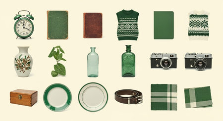 A curated collection of various arranged on a neutral background. The include a vintage green alarm clock, a stack of green books, a brown leather-bound book, a green knitted sweater vest, a green notebook, and a green and white patterned sweater. Below these are a decorative vase with olive branches, a leafy plant, glass bottles, and two vintage cameras. The bottom row a wooden chest, two plates with green rims, a brown leather belt, and two swatches of green plaid fabric. The overall...