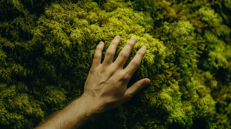 A gentle hand caresses the soft moss of a vibrant green tree on international day of forests