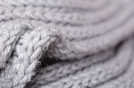 Warm grey knitted sweater or scarf in cozy home atmosphere Close up wool fabric texture background C