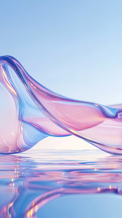 A sculpted wave shape made of transparent glass with reflections of pastel sky colors on a reflective surface.