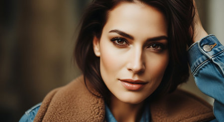 Stylish young woman with long dark hair posing in fashionable black shirt, showcasing modern elegance and confidence
