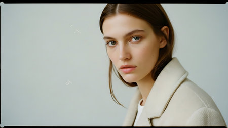 A young woman stands with her head turned slightly, showcasing her beautiful blue eyes and freckles against a neutral backdrop. Her hairstyle adds to the overall serene atmosphere.