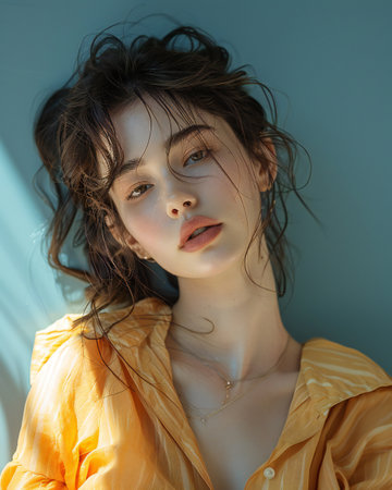 Close up portrait of a young model with curly hair, illuminated by soft sunlight, creating a fresh and natural look