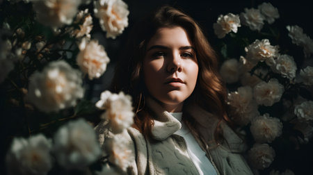 A captivating portrait of a young woman wearing a cozy sweater, surrounded by vibrant flowers. Soft focus adds warmth, embodying joy and tranquility.