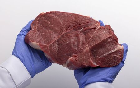Laboratory control. Lab worker in protective gloves holding piece of raw meat, close up