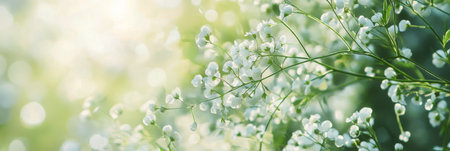 Delicate white flowers flourish in a tranquil garden, illuminated by soft sunlight. The lush greenery in the background creates a peaceful and refreshing atmosphere, perfect for relaxation.