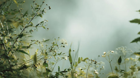 A serene nature scene featuring delicate wildflowers amidst soft green foliage. The dreamy blurred background evokes tranquility and connection with the outdoors.