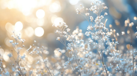 Tiny white flowers bloom softly under the golden light of a peaceful summer evening.
