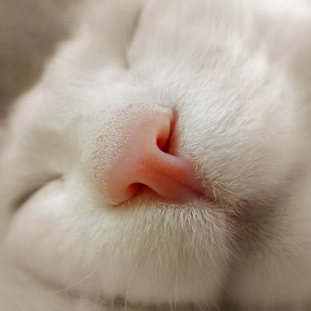Cute feline pink nose macro close-up, White red cat with a mustache macro