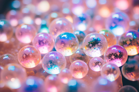 Delicate iridescent bubbles resting on a smooth reflective surface create a dreamy aesthetic. This image evokes a sense of tranquility and modern elegance, perfect for artistic and creative projects.