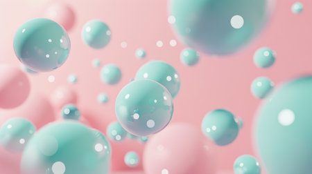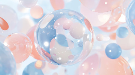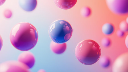 Spheres of different sizes float in a light pastel gradient background with shades of pink and blue.