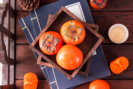 Ripe persimmons in a bamboo basket. Top view, wooden table background and persimmon set.
