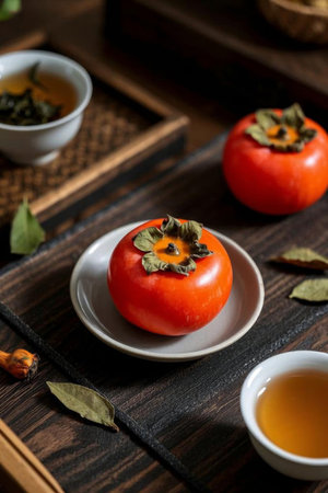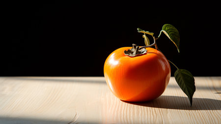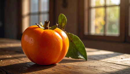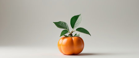 A striking persimmon showcases its vibrant orange hue and green leaves, beautifully arranged against a soft neutral backdrop, capturing nature's bounty.