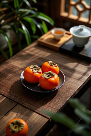 AI Generated. Persimmons arranged on a white table in a bright kitchen seen from above