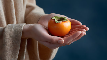 Tasty persimmon fruit in a hand closeup. Organic fresh persimmon from fuyu fruit garden farm. Raw orange diospyros.