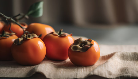 Ripe orange persimmons hanging on a branch with green leaves, presenting fresh and healthy fruit against a warm muted background, perfect for copy space