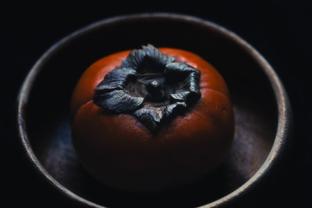 Ripe Persimmon on Yellow, Vibrant Orange Fruit, Glossy Skin, Isolated on Yellow Background