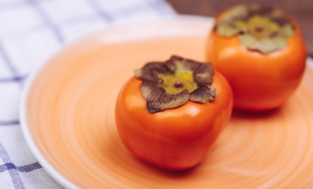 Ripe fresh persimmon on wood board. Food ingredient. Fruits