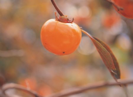 The Persimmon tree in fall, warm amber light, crisp air, shallow depth of field, soft natural bokeh, true to life color, minimal styling.