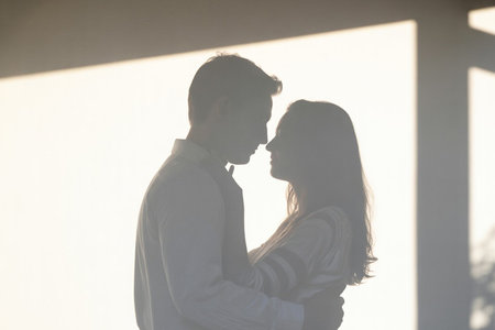 Silhouetted couple man and woman stands close in dramatic backlight, foreheads nearly touching. A moody, intimate moment of love, connection, and emotion captured in soft shadow and glow.