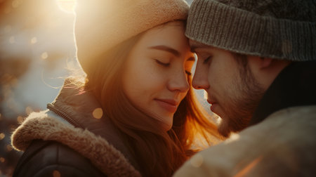 A joyful young couple shares a tender moment, their faces close and smiles bright, conveying warmth and connection.